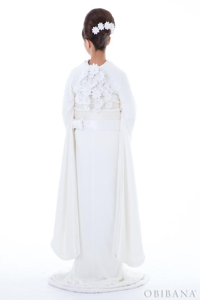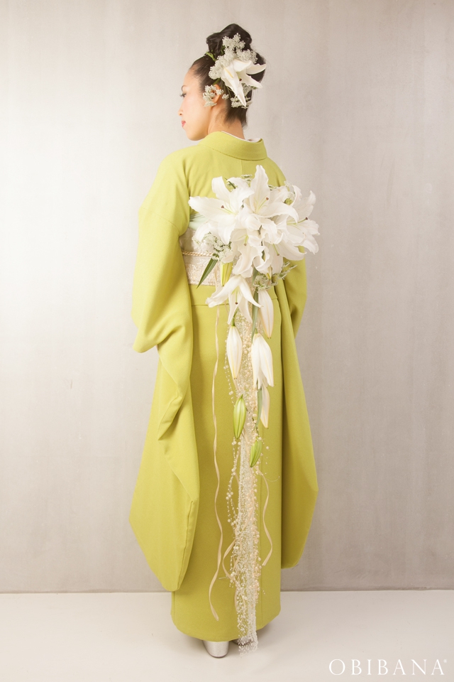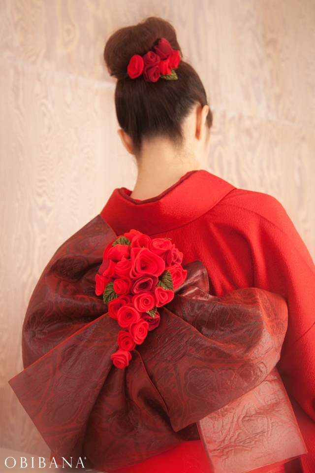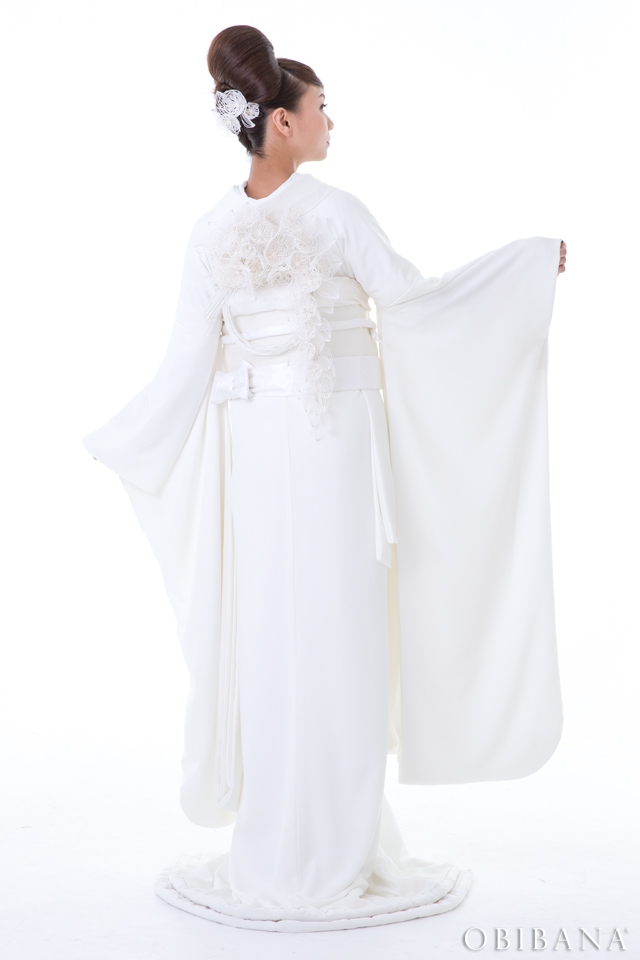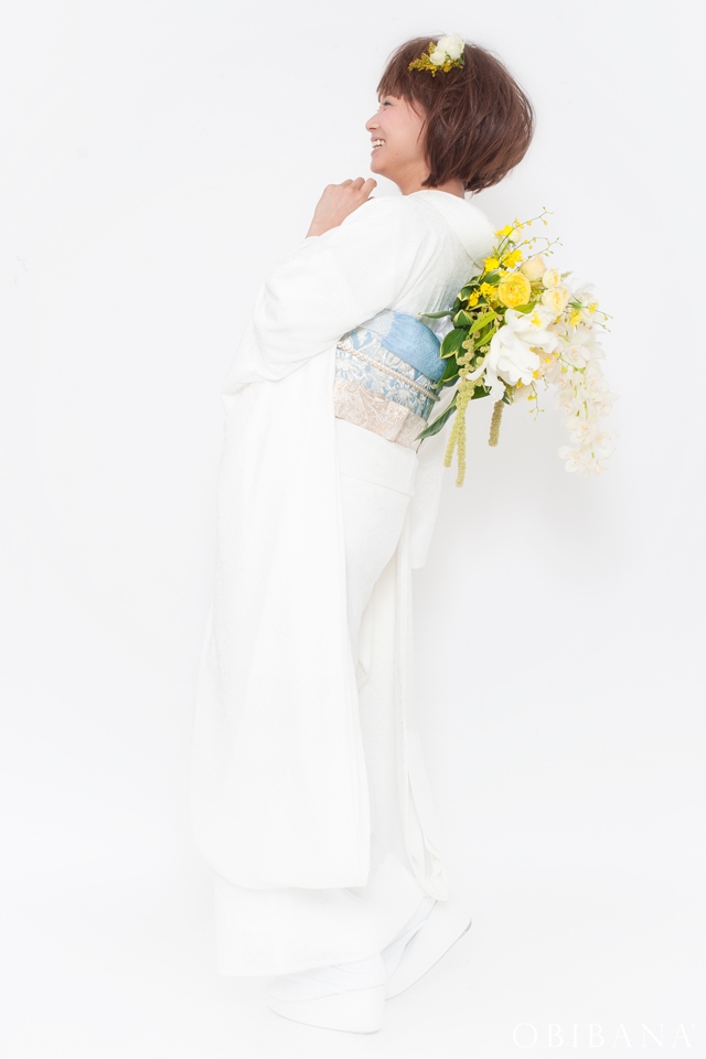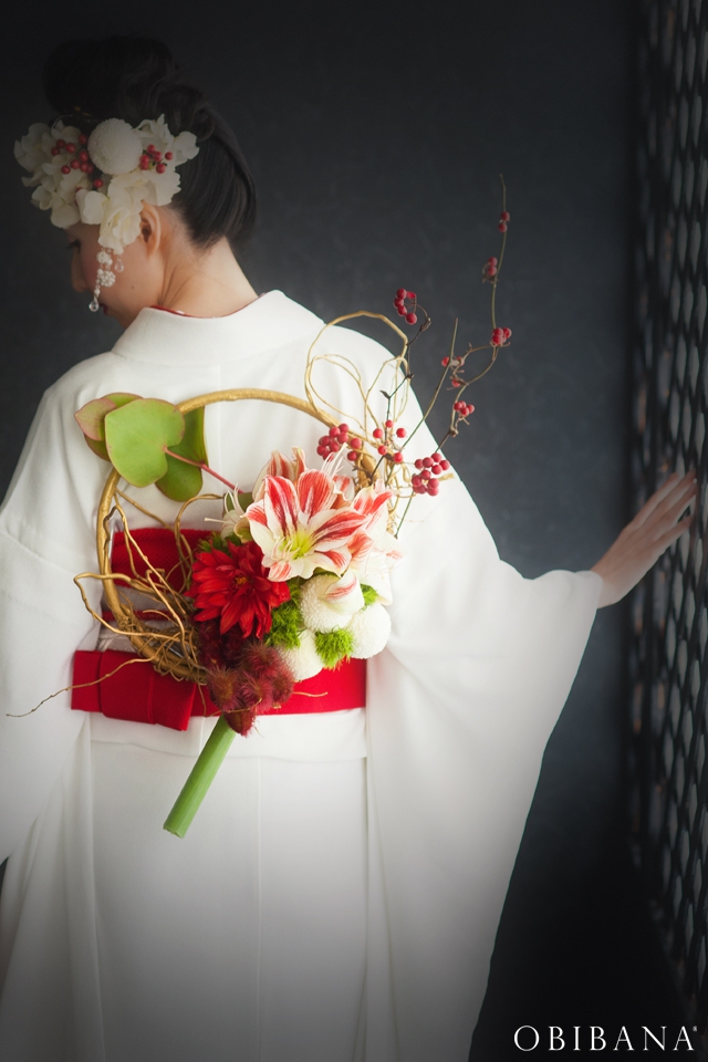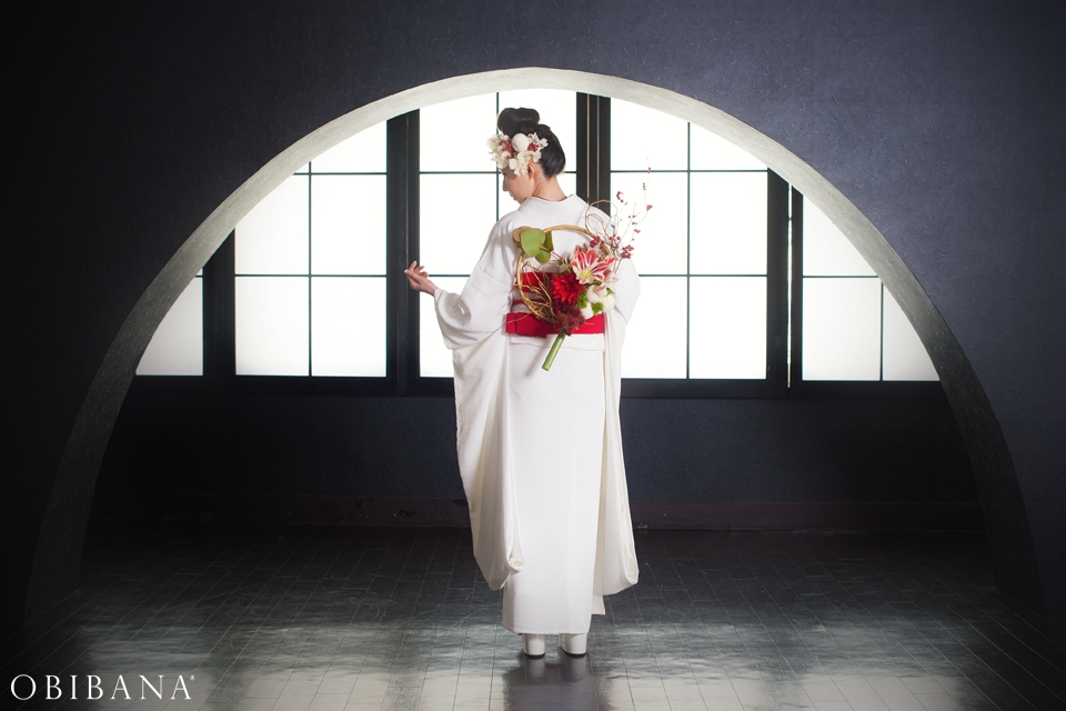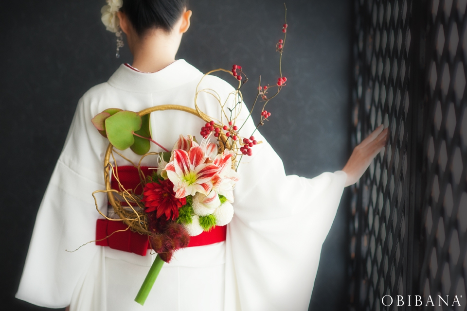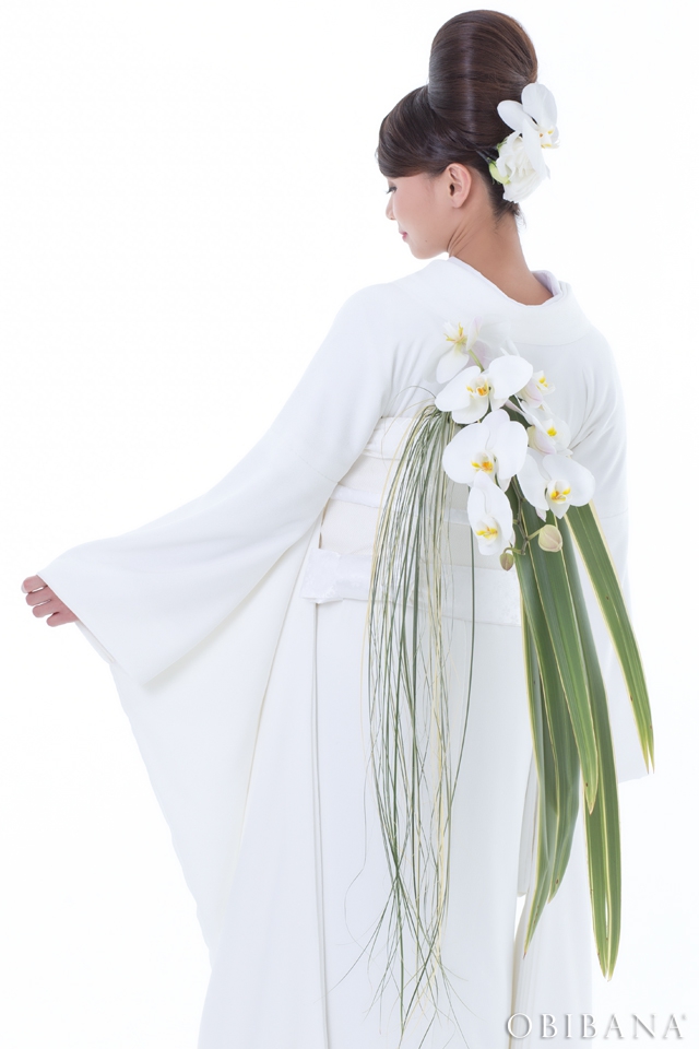 ウエディングの場合、挙式で「帯花オリジナル振袖+帯花」を、披露宴にてドレス着用の場合「帯花」で