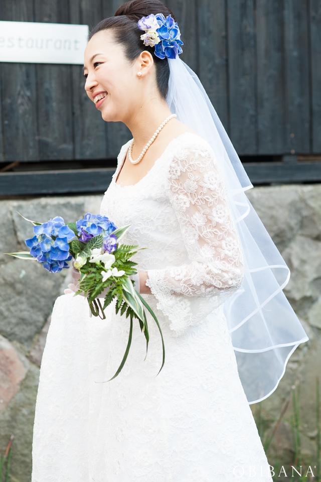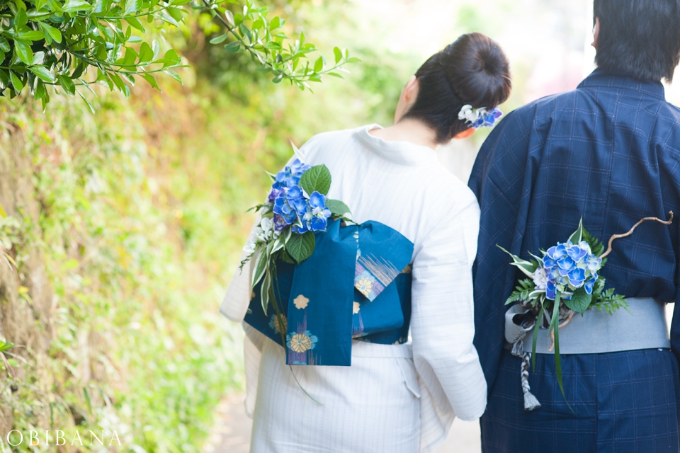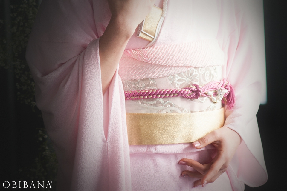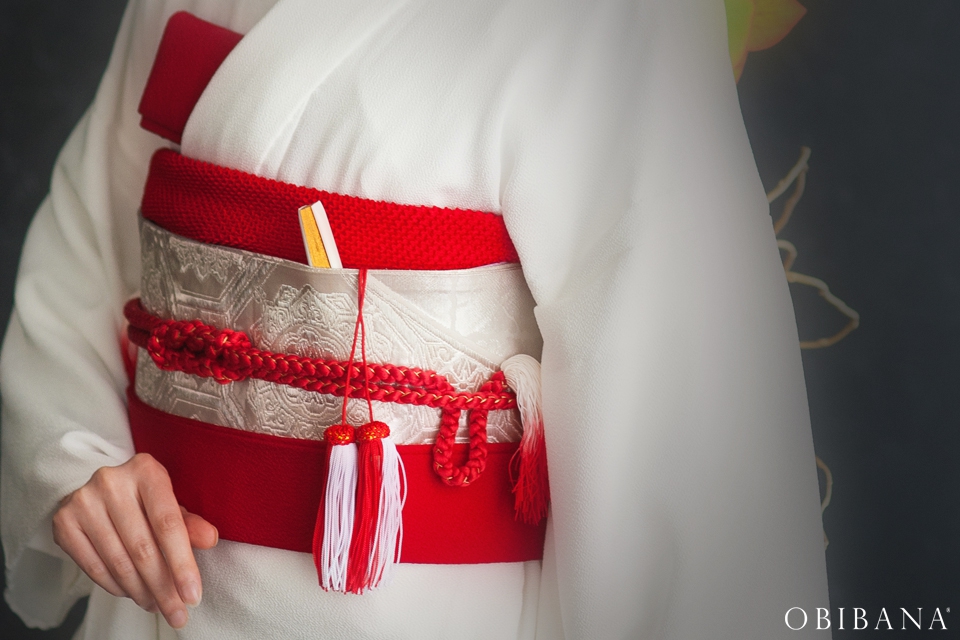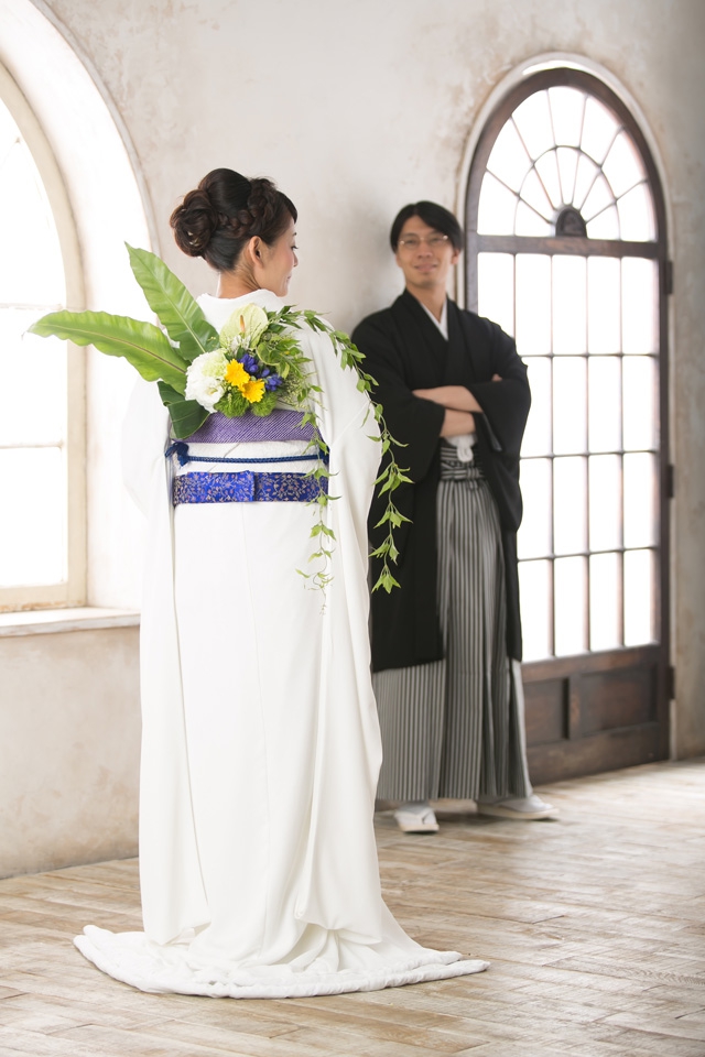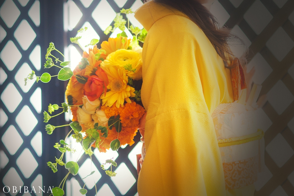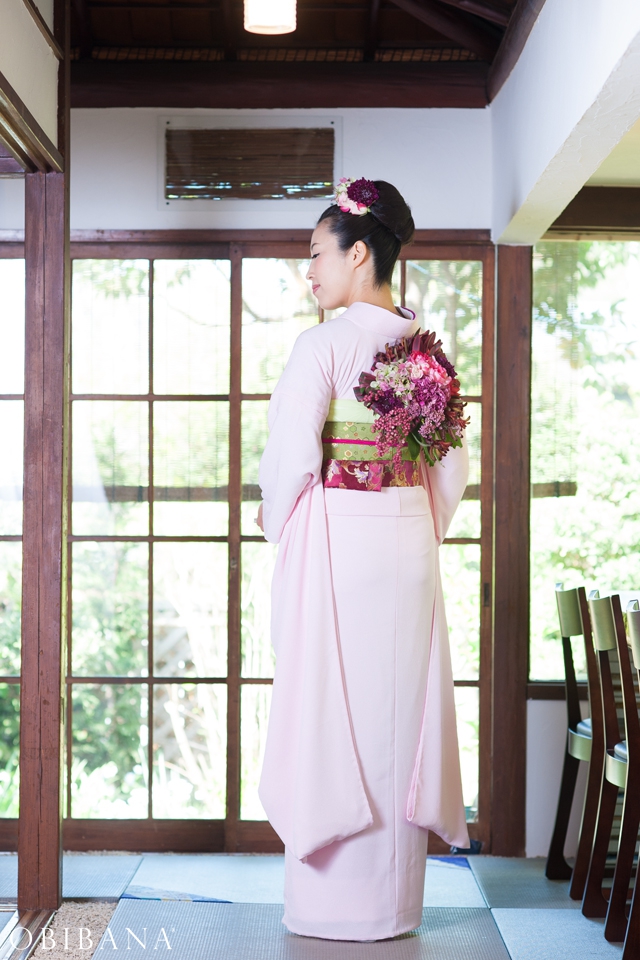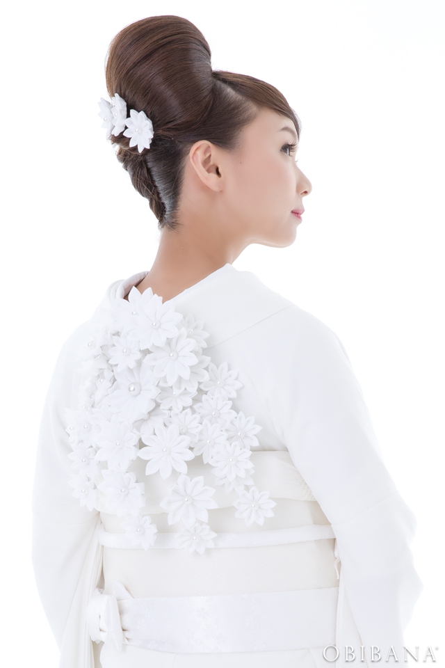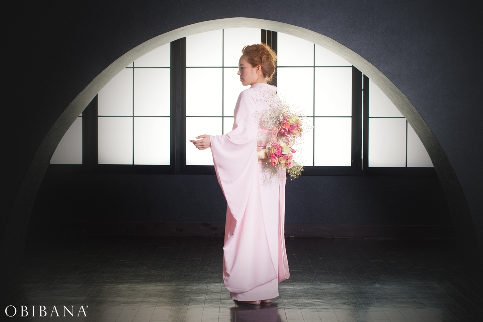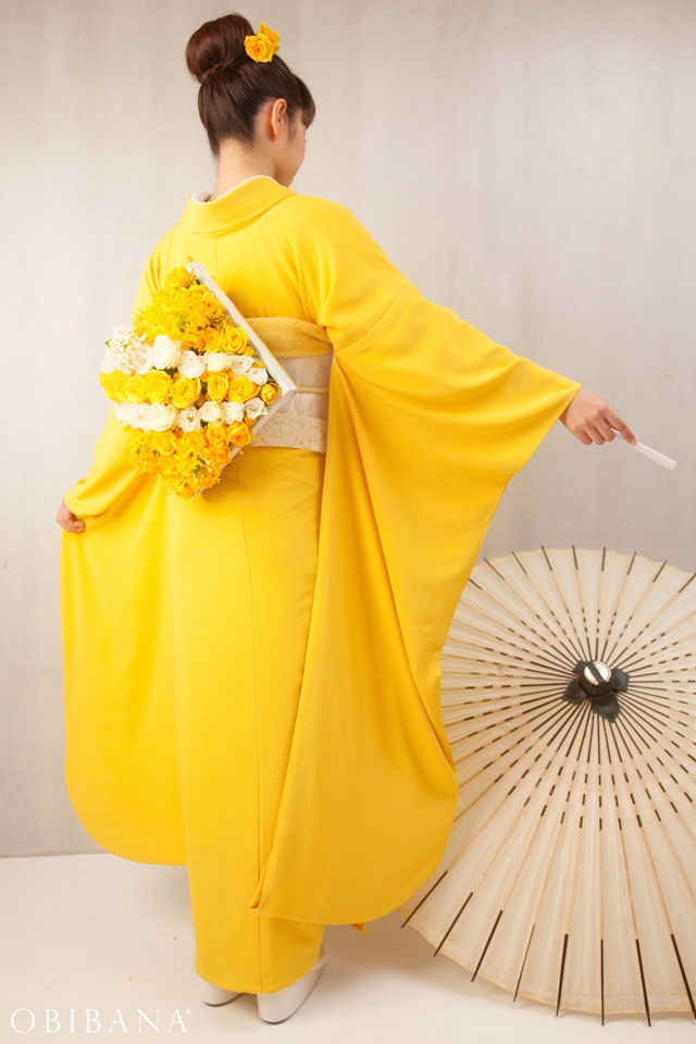 ウエディングの場合、挙式で「帯花オリジナル振袖+帯花」を、披露宴にてドレス着用の場合「帯花」で
